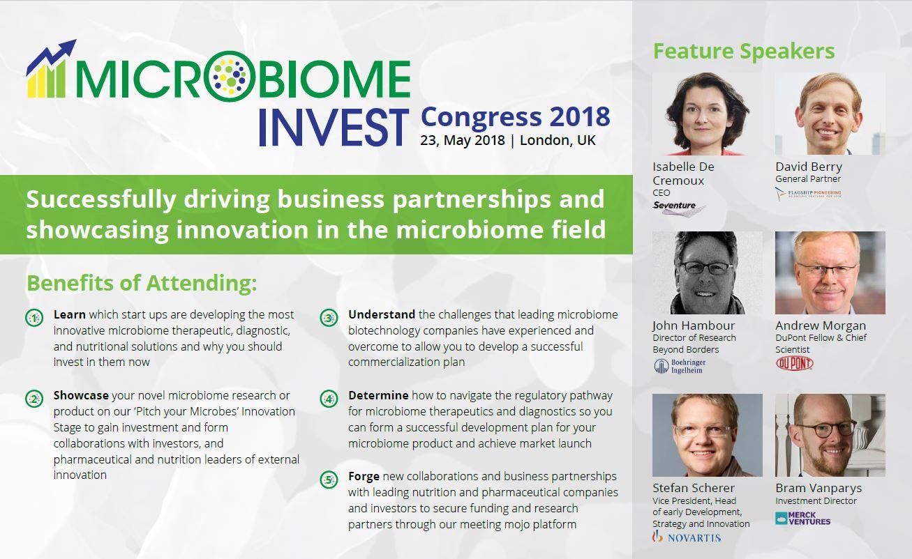 The Microbiome Invest Congress 2018 is dedicated to showcasing the most innovative emerging companies and academics with commercially viable research that manipulates the microbiome. Active investors, and multi-national nutrition and pharmaceutical companies will also share their knowledge and perspectives on commercialisation and discuss the most cutting-edge products and research in the microbiome space.